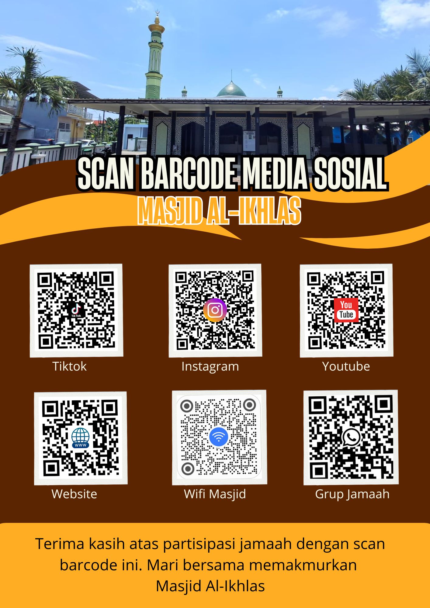 Terima kasih atas partisipasi jamaah dengan scan barcode ini. Mari bersama memakmurkan Masjid Al-Ikhlas.