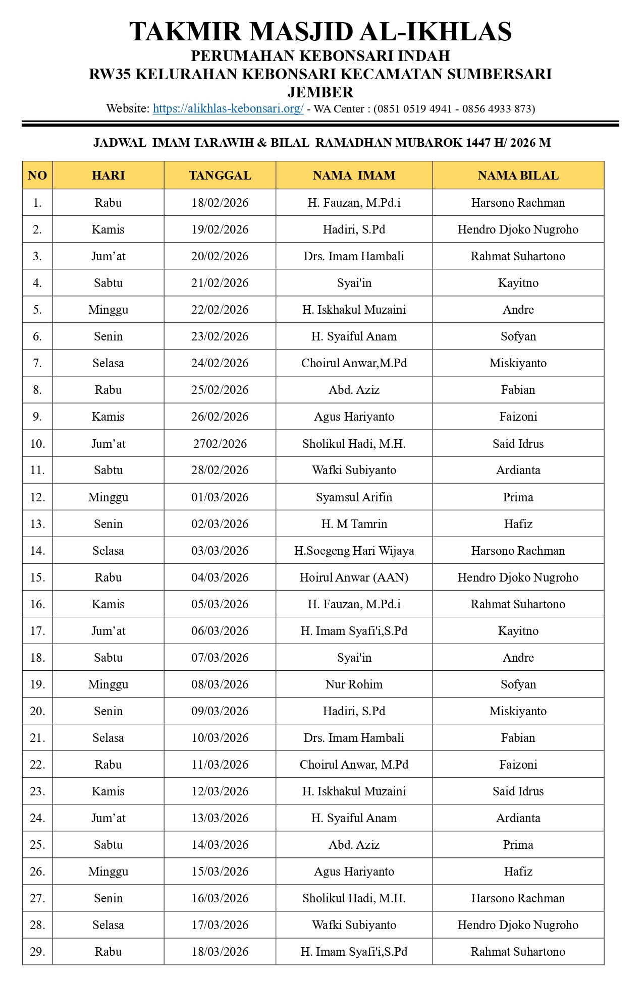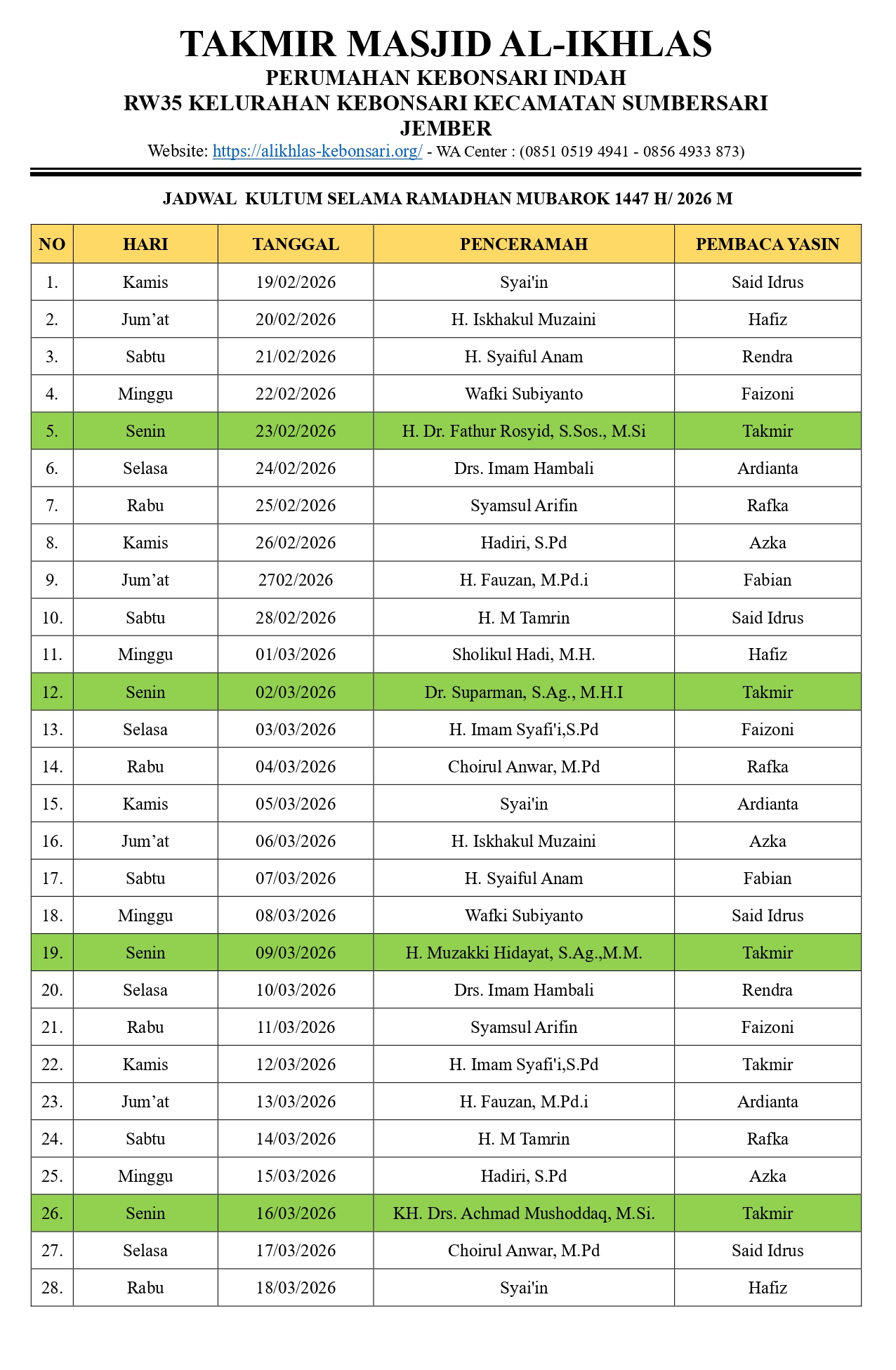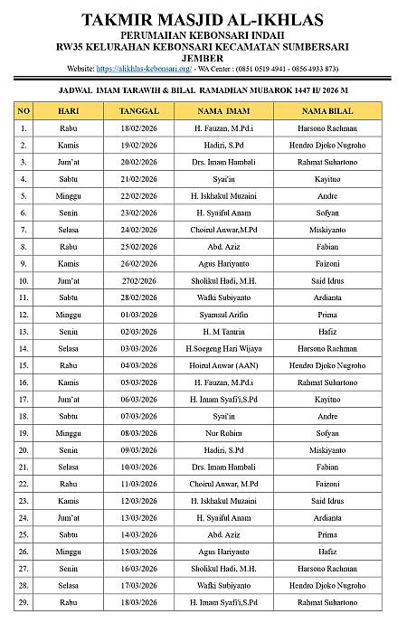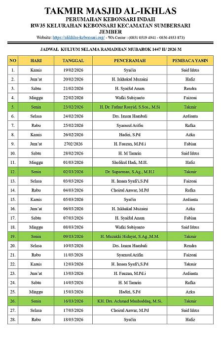 Masjid Al-Ikhlas mengundang seluruh jamaah untuk hadir dan berpartisipasi dalam rangkaian kegiatan Ramadhan: