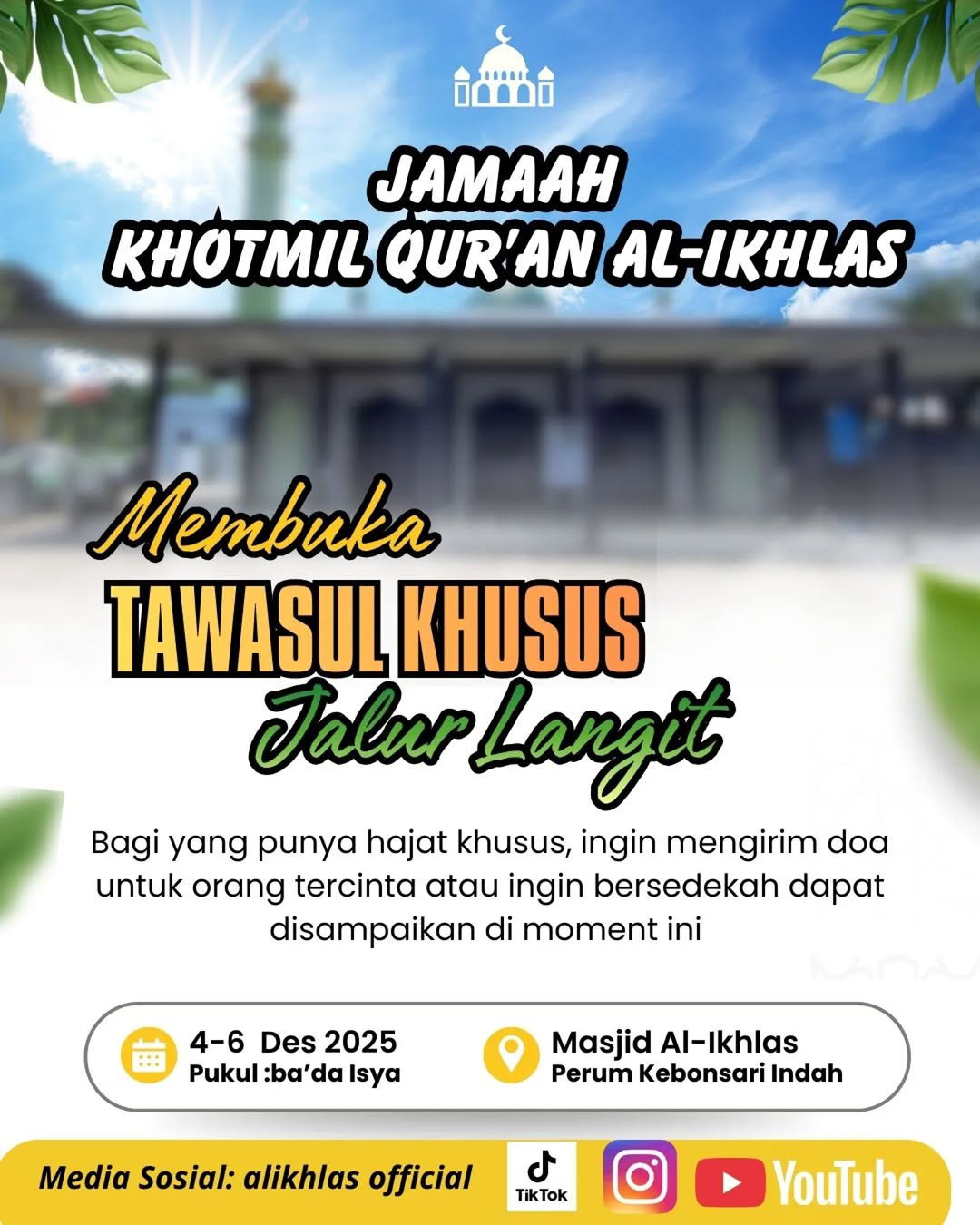 Bagi yang memiliki hajat khusus, ingin mengirim doa untuk orang tercinta, atau ingin bersedekah/infaq terbaik, dapat disampaikan dalam momen ini